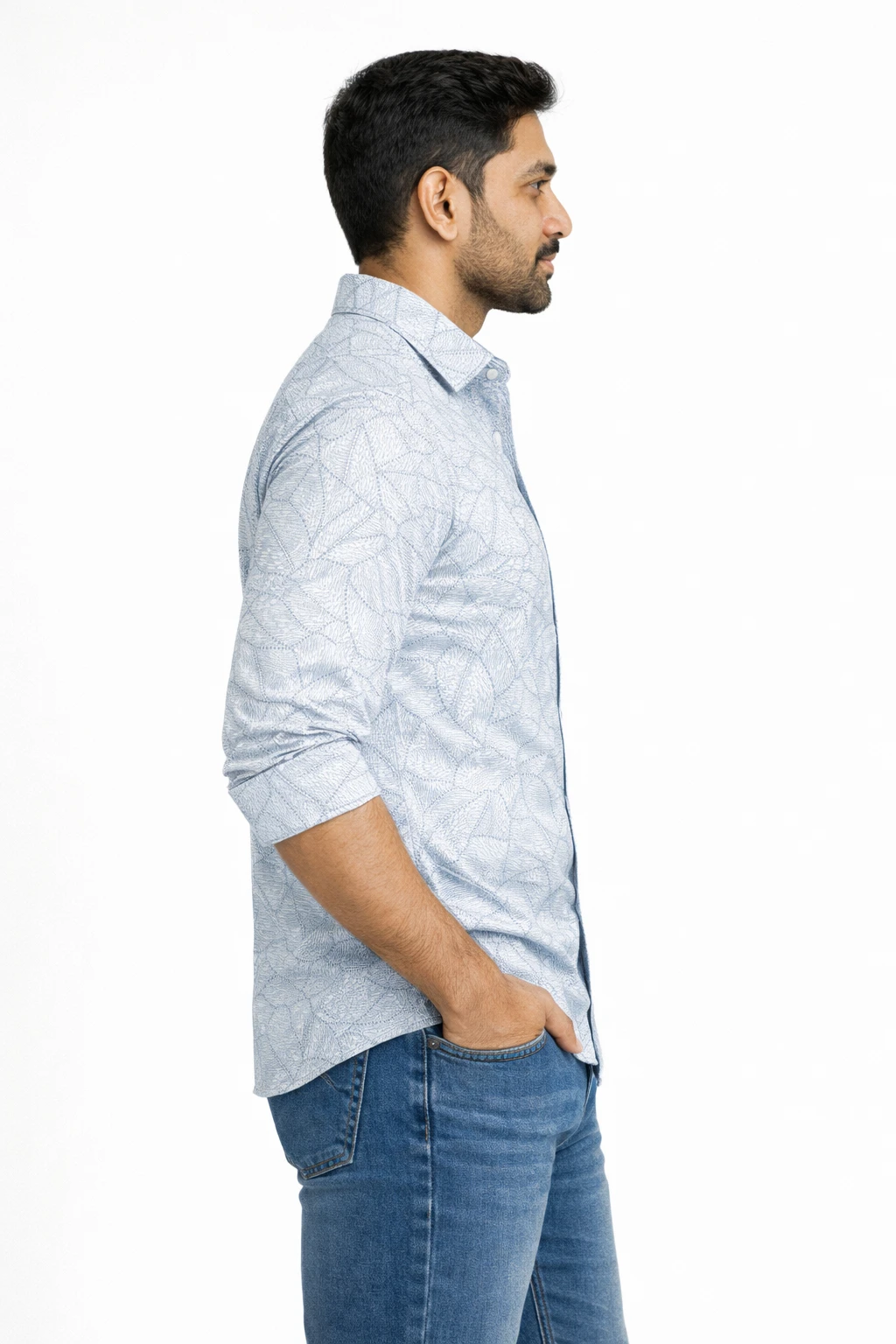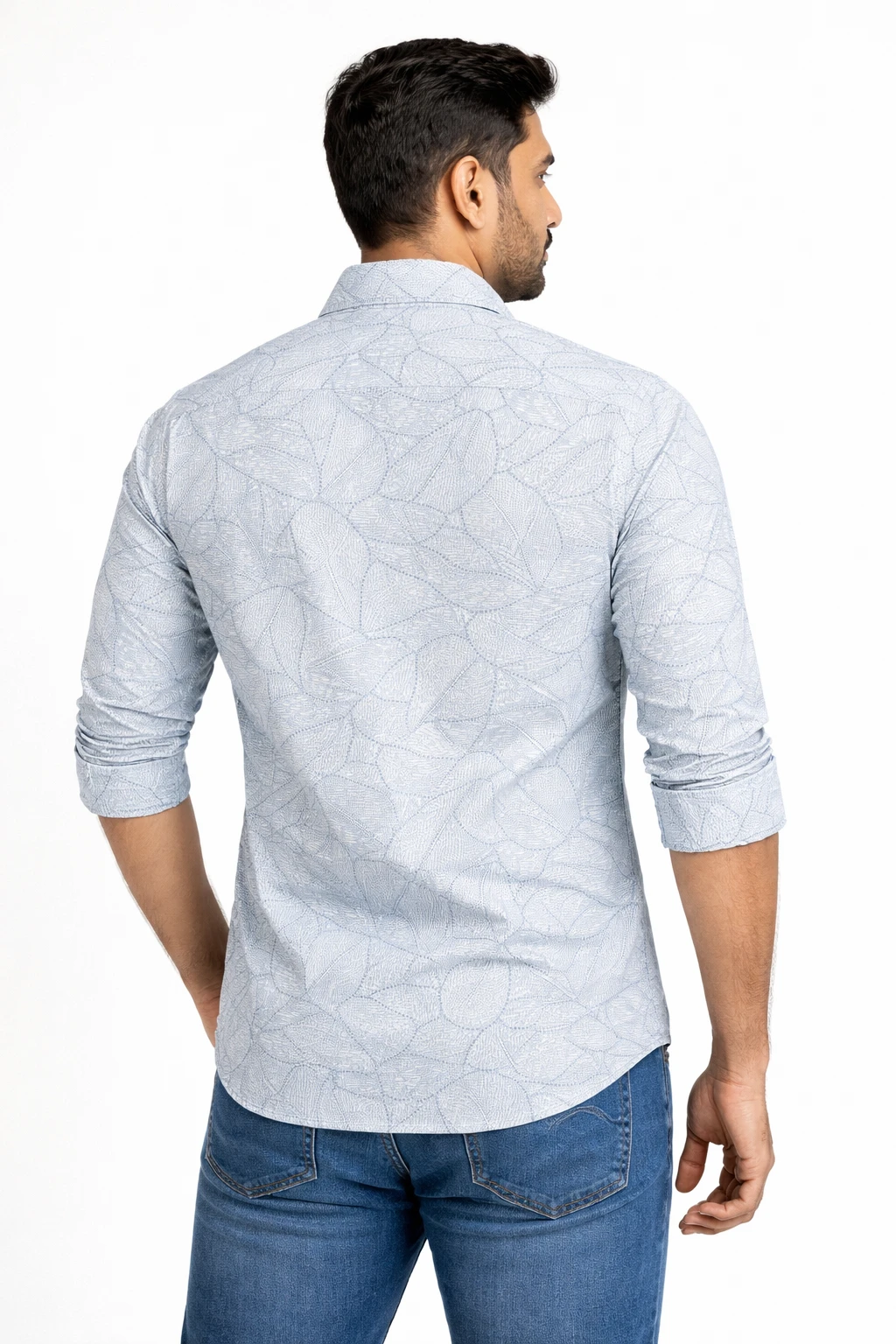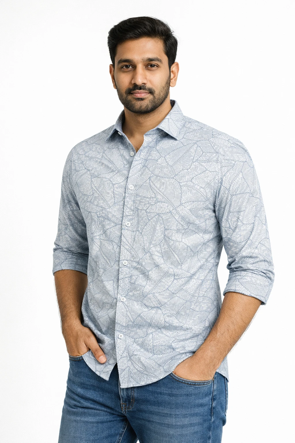 Light blue printed shirt designed with an all-over subtle pattern. Features a spread collar, full button placket, and long regular sleeves for a refined yet relaxed look. Crafted to deliver comfort and effortless style, suitable for everyday casual and smart-casual occasions.