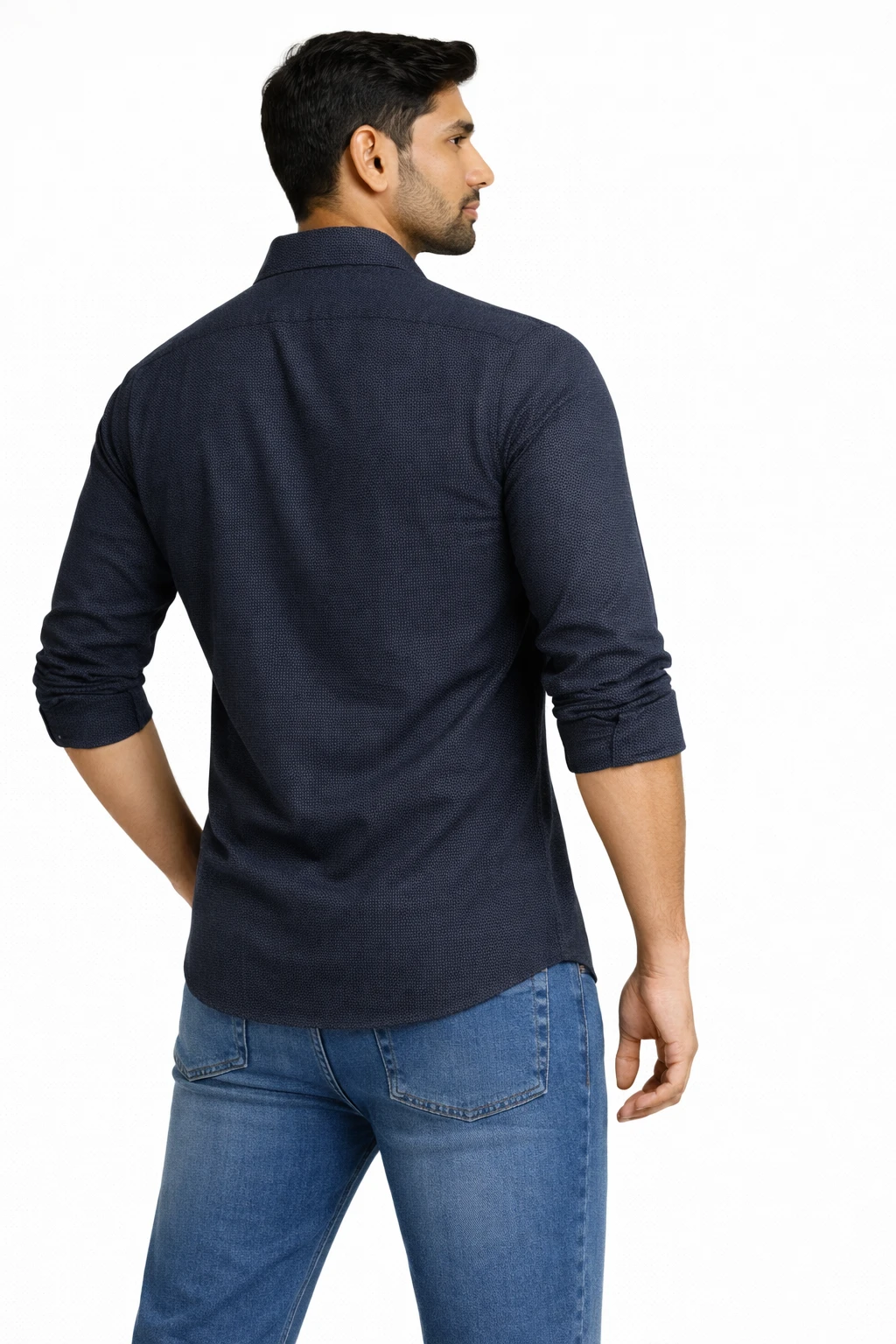 Navy blue shirt featuring a subtle micro-textured finish for a clean and refined appearance. Designed with a spread collar, full button placket, and long regular sleeves for a sharp everyday look. Perfectly suited for casual and smart-casual styling.